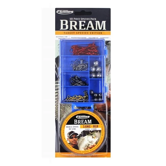 The Bream pack has 100 pieces of tackle including chemically sharpened long shank and baitholder hooks as well as swivels and ball sinkers packed in a tackle box.