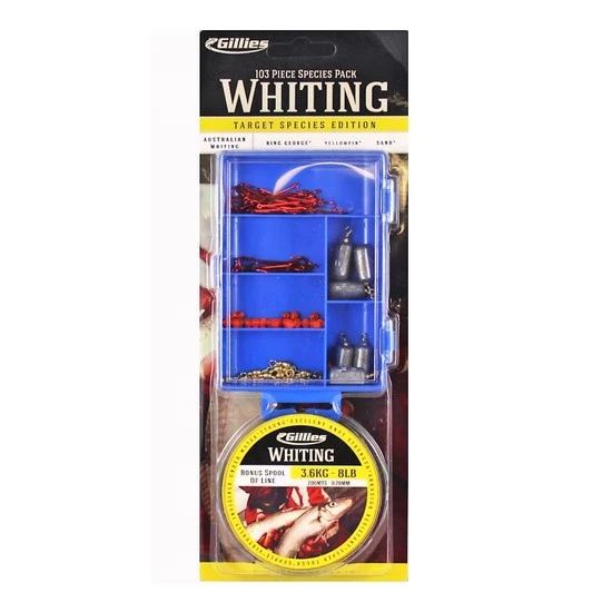 The Whiting species pack is a 100 piece kit containing red chemically sharpened long shank hooks, attractor beads, swivels and bomb sinkers – packed in a sturdy tackle box.