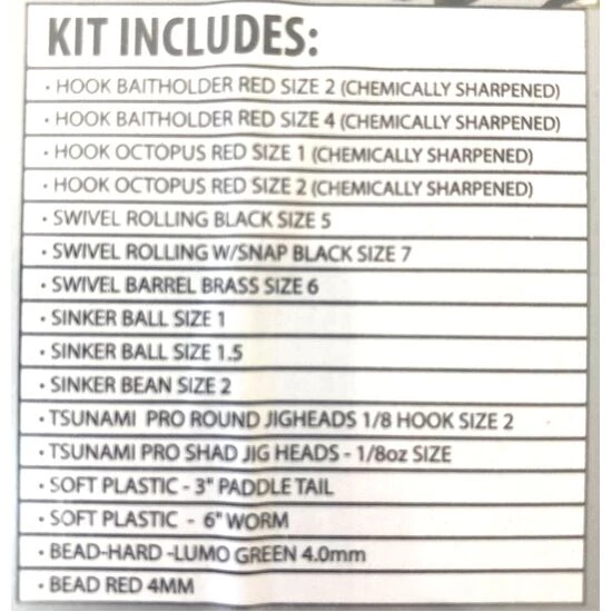 Included in this pack is assorted hooks, swivels, sinkers, beads, soft plastic lures and jig heads.
