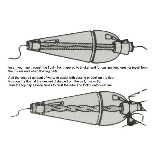 Rig with the narrower end of the float toward the rod tip when retrieving lures and flies, or rig with the wider end of the float toward the rod tip when suspending baits.
